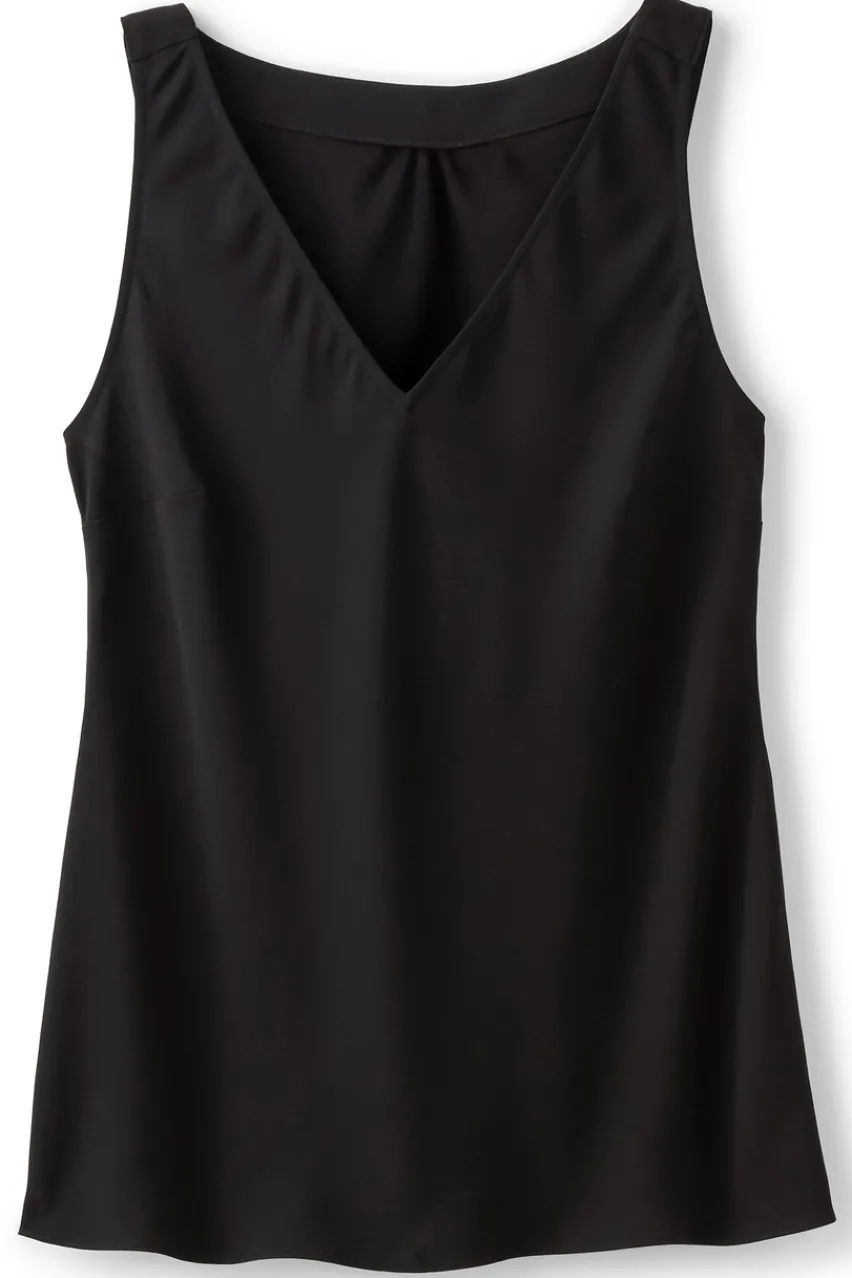 Looking for a polished tank you can wear and pair through shifting seasons? This versatile V-neck is it. With a gentle drape, shirring at the center back neck and a flattering curved hem, it stands out as anything but basic.