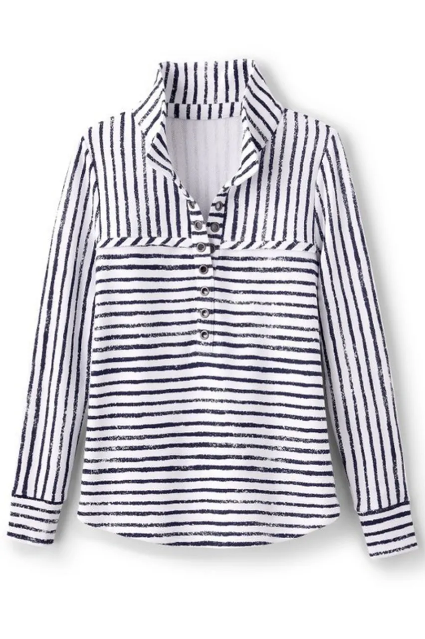 Once you slip on this tunic, you will be in love. The French terry is so soft and divine, it feels like your favorite cozy bathrobe against your skin, but it looks so chic and fresh outside with a polished finish and amazing details from the nautical-inspired grommets to the raw edge seaming at the bustline. It’s perfect for those chilly early days of spring when the wind is still blustery. Curved shirttail hem. Partial placket, front and back yokes. Long sleeves.